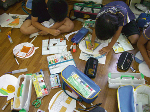 家から持ってきてもらったうちわに、白い紙を貼って、うちわ型に切る作業から。