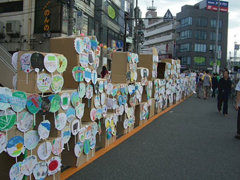 いよいよ夏祭り本番。800枚全てのウチワを、格子状に積んだ段ボールに展示する。