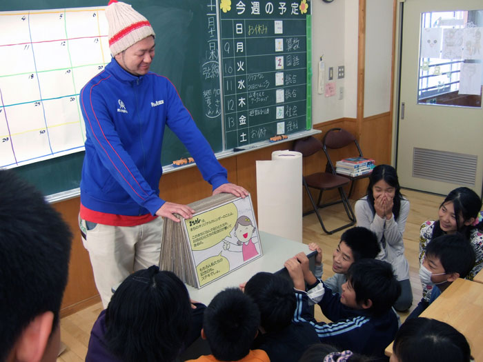 まずはじめに、プロジェクトの内容を、子どもたちに知ってもらうために、流れを紙芝居にして説明。