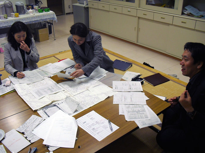 取材前夜。担任の先生3人と、申し込み用紙と児童を照らし合わせ、取材担先リストを作り、地図を見ながら場所の確認。
