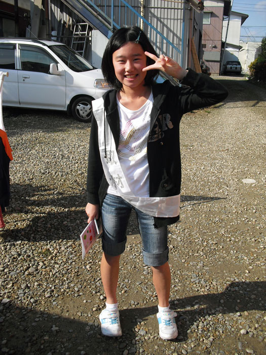 取材のときはこのタスキを肩にかける。平日の昼間に子どもたちがまちへ繰り出すので安全面も考慮した秘策。