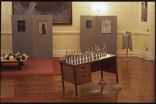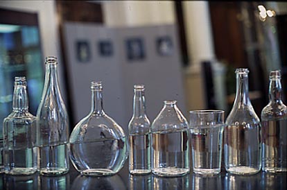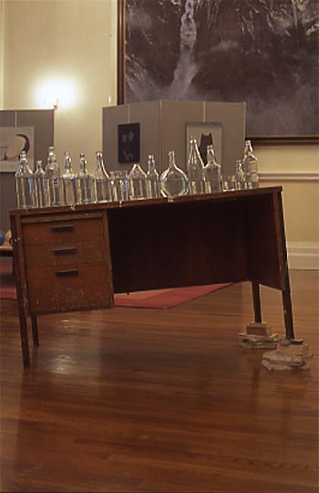 At the center of the exhibition room, transparent, colorless anonymous glass bottles are lined up on a tilted table. The water they contain represents, the shedding of light on something that has been overlooked.