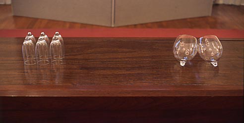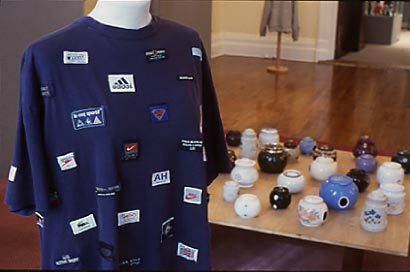 A wine glass that has had its leg cut off generates a totally alien identity, while on a T-shirt dozens of brand-tags are stitched onto it, as if denying its individuality.