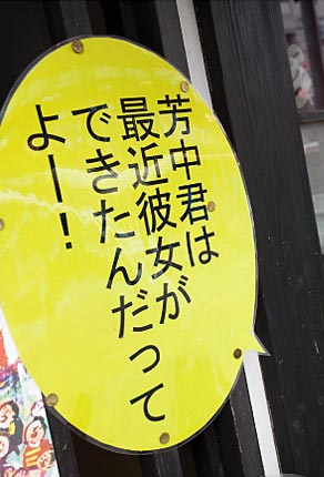 I spent time listening to conversations in each shop. Things that shop managers and keepers felt happy about recently, something they are proud of, their hobbies, their troubles... these everyday matters were printed on speech-balloon-shaped boards and put up on the shop front.