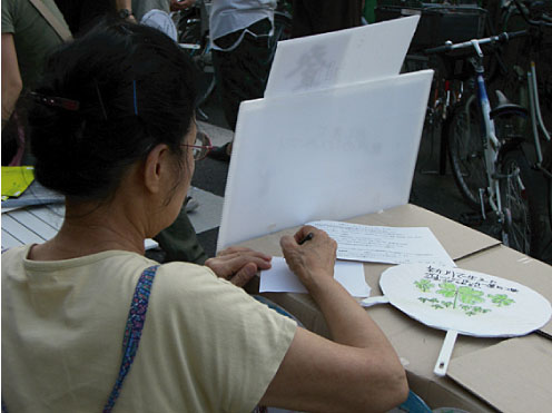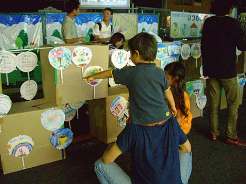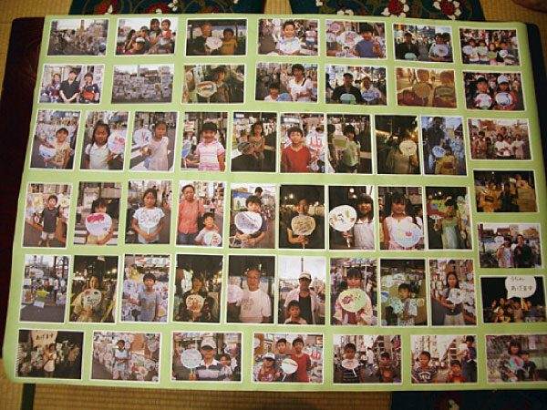 800 fans were drawn and written on by all the student of Noborito Elementary School. They suddenly appeared on the night of the local summer festival. If passers by like one they were free to take it. A Ceremonial photo is taken with them and the fan, and they leave a message for the child who made the fan. Those photos and messages were displayed in the town and then given as present to the school. That is how it works.