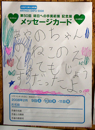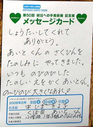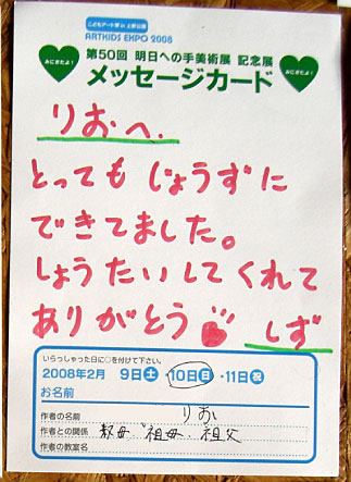 Art Kids EXPO 2008 took place in The Ueno Royal Museum and Ueno Park, and as one of its art projects, children sent invitations to their grandfathers, friends, teachers, headmasters, anyone associated with particular memories, mass media and educational institutions, whoever they wanted to invite.