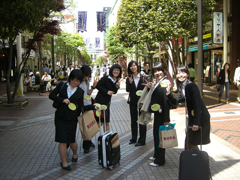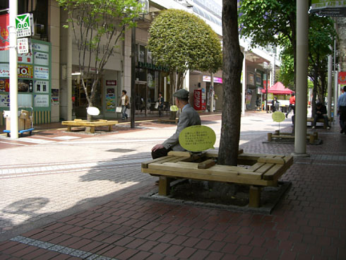 植え込みに設置したうわさパネルとうわさポールを商店街のおかみさん集団にプレゼント