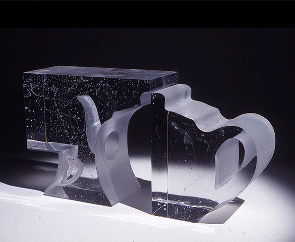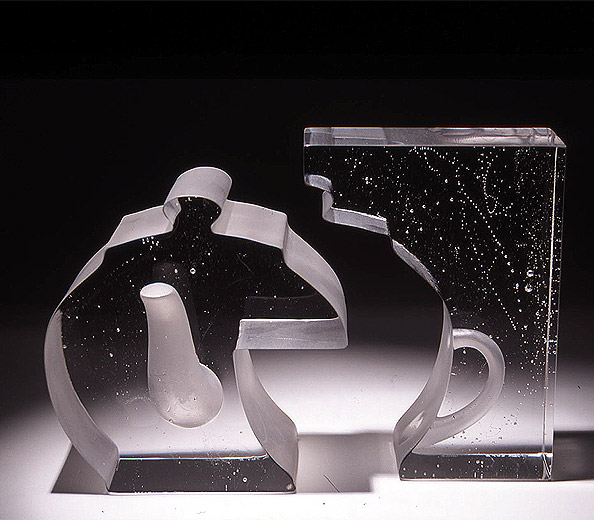 Illusive, elusive, and allusive, are all appropriate words for the kinds of image I make in cast glass based around the presence or absence of everyday shapes. The charmed transparency of thick clear glass and the way light travels through it, held up by unpolished surfaces within the images, are my means of communication.
